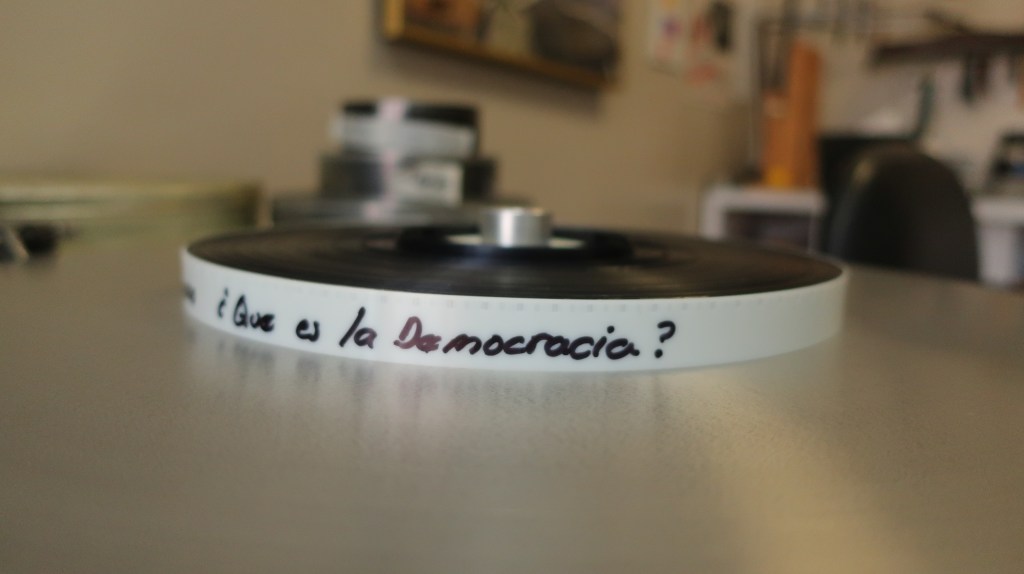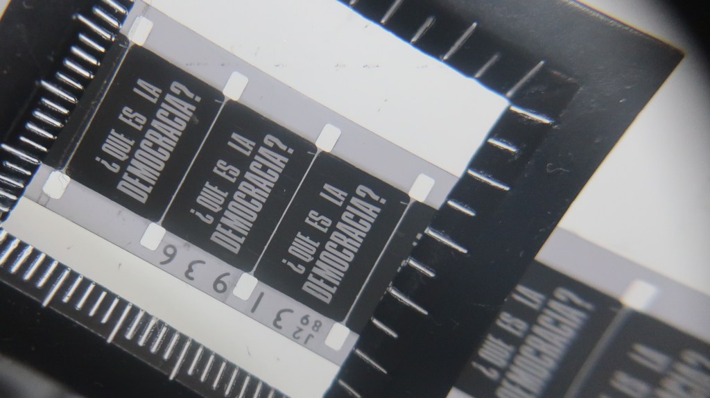 Los negativos originales de imagen y sonido de la película «Qué es la democracia» se conservan en la colección DCC-Carlos Álvarez depositada por el autor desde 1991 en la Fundación Patrimonio Fílmico Colombiano.